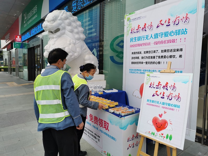 2020 年3 月,民生银行南宁分行营业部在网点外设立“无人值守爱心驿站”,为医护人员、义工、警察、环卫工人、外卖快递人员等群体提供免费早餐,疫情期间他们奋战在一线,为这座城市带来温暖和希望, 南宁民生人也用最朴实的方式,将爱心与热情,传递给这群最可爱的城市守护者。“无人值守爱心驿站” 在当地引起广泛关注,小小驿站,展现了民生银行的温暖名片。