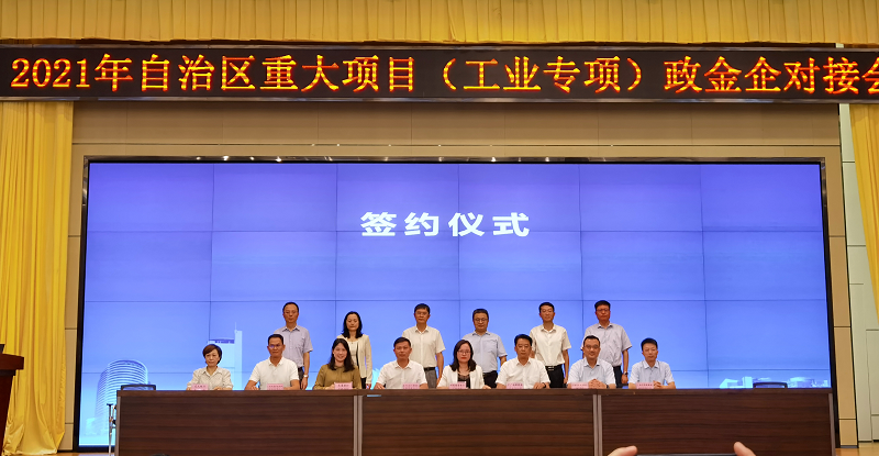 8月3日,2021年自治区重大项目(工业专项)政金企对接会在南宁召开。会上,相关项目业主与金融机构共签订了14份合作协议,在自治区发改委副主任莫前锋、自治区地方金融监管局副局长战勇、邮储银行广西区分行副行长高山等领导的见证下,邮储银行广西区分行公司金融部副总经理邓华恩与中广核新能源广西分公司副总经理兼财务总监王毓分别代表双方签订战略合作协议。