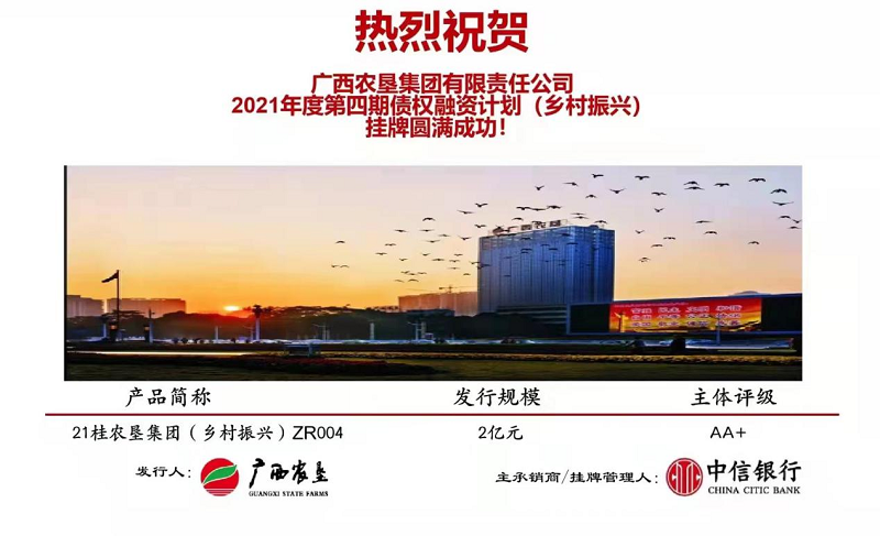 11月24日,中信银行南宁分行发行“广西农垦集团有限责任公司2021年第四期债权融资计划(乡村振兴)”,发行金额2亿元,发行期限1年9个月。这是中信银行南宁分行以资本市场精准滴灌的首笔乡村振兴北金所债权融资计划结构化融资业务。