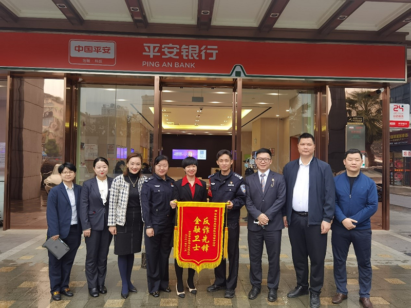 近日,平安银行南宁分行因客户识别能力强、警觉性高、协助公安机关抓获犯罪嫌疑人、警银合作有力,受南宁市公安部门授予“诈先锋 金融卫士”的锦旗。