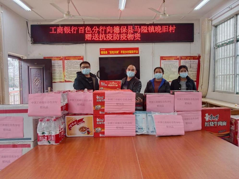 工行百色分行向德保县马隘镇晚旧村赠送抗疫防疫物资。
