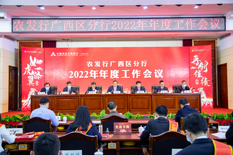 拉高标杆、接续奋斗,进一步提升支农履职成效。会议指出,全行上下要充分认识当前面临的机遇和挑战,抢抓先机,高质量完成2022年工作目标,贷款余额净增400亿元以上,推动履职发展量增、面扩、质优。突出重点、抓住关键,持续擦亮粮食、农地、水利和绿色“四大品牌”。服务好国家粮食安全,大力支持糖业、海洋产业、畜牧业、桑蚕等广西特色优势产业做大做强,巩固脱贫攻坚成果同乡村振兴有效衔接,助力“新基建”提速升级,突出支持重大水利工程、港口水运码头、城市供水一体化等群众热盼的水利工程项目,围绕“双碳”战略加大绿色产业资金支持力度。