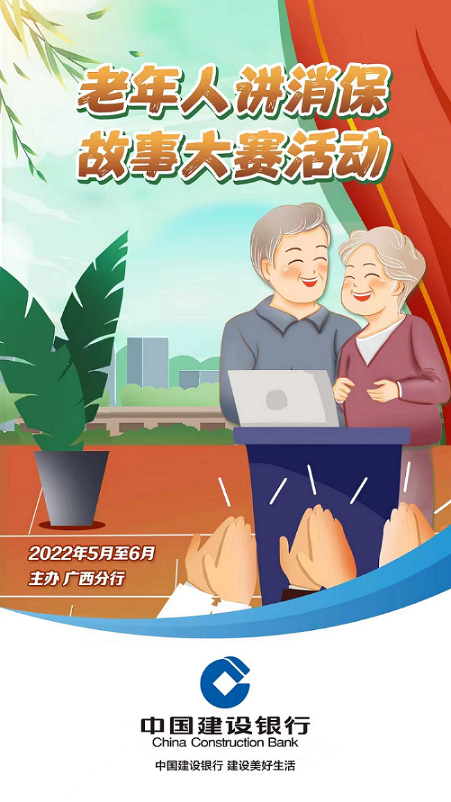今年5月,中国建设银行“共话幸福晚年”老年人讲消保故事大赛即将在广西率先鸣锣开赛。此次大赛由中国建设银行主办,建行广西区分行承办,深圳、内蒙古、湖北、上海、北京、厦门、青岛、云南、贵州、福建、宁波等11家分行共同参与。