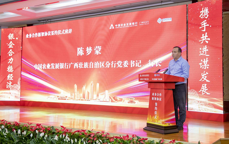 陈梦蒙在签约仪式上致辞表示,当前,稳住经济大盘,农发行责无旁贷、当仁不让。将重点做好“四篇文章”,坚决守稳“三农”基本盘。一是做好大局大势文章。主动在国家战略全局和自治区发展大局中展现新担当新作为,积极参与西部陆海新通道、北部湾国际门户港、桂林世界级旅游城市建设等重大战略落地实施,重点支持平陆运河、150项重大水利工程、102项国家重大工程等一批国家级、自治区级影响力大、社会效益显著的重大项目建设。二是做好托底稳盘文章。秉持家国情怀,加大对“三农”重点领域、薄弱环节和脱贫地区的投入力度,6月贷款净增100亿元以上。服务国家粮食安全,全力支持夏粮收购和重要农产品稳产保供。服务巩固拓展脱贫攻坚成果,突出支持44个乡村振兴重点帮扶县。服务农业农村建设,大力支持“适度超前开展基础设施投资”,助力经济稳增长。三是做好创新引领文章。发挥广西生态优势,积极发展绿色金融,探索碳资源金融化、生态保护补偿融资机制,创新资金供应链模式,推进多元化担保方式,打通资金供需的“路”和“桥”。全面履行社会责任,积极向人民银行请领碳减排支持工具资金,大力推进“桂惠贷”,有效解决企业“融资难”“融资贵”问题。四是做好融资融智文章。坚持以客户为中心,为优质客户量身定制服务方案,按照“综合成本不高于同业,综合效益不低于同业”的原则,提供一揽子、差异化的金融产品,在信贷规模配置、利率定价、贷款期限等方面给予最大限度优惠,全力满足项目推进和客户发展需要。