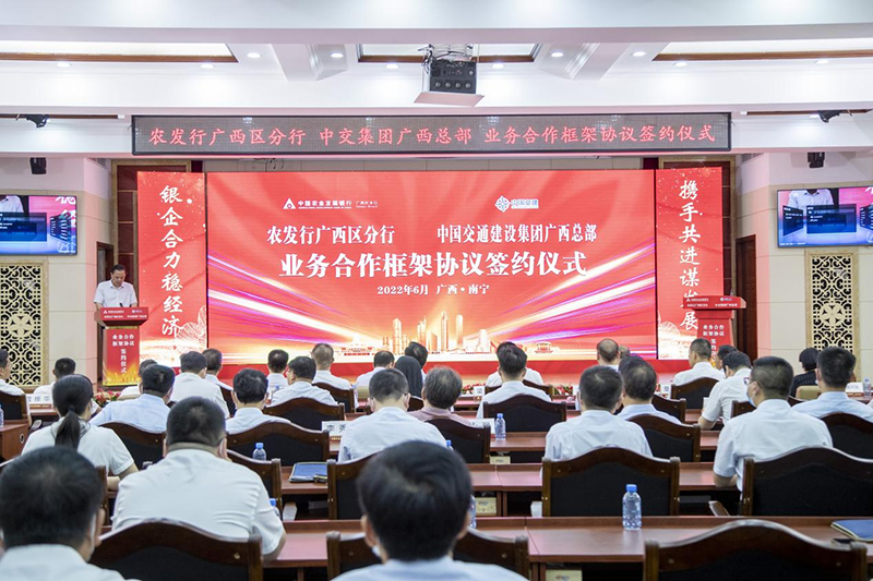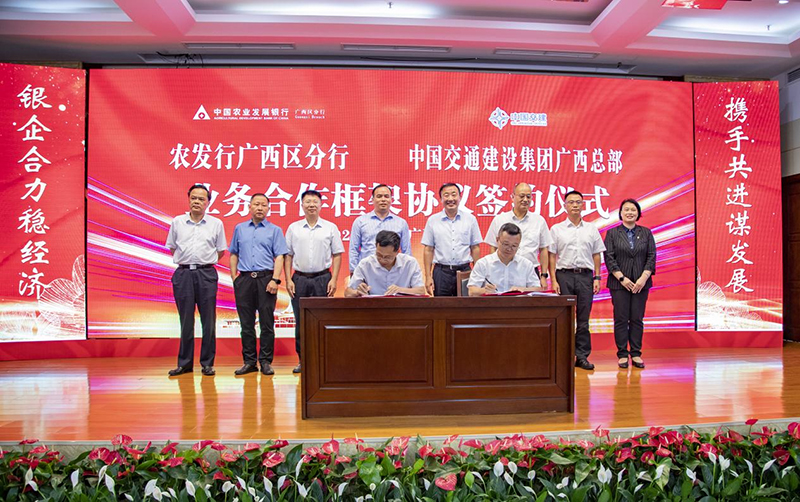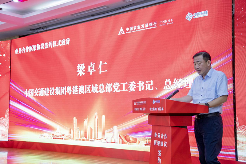 梁卓仁致辞表示,中交集团深度融入和服务广西发展,持续加大在广西的投资建设力度。截至目前,在广西在建项目148个,合同额1600多亿元;正在积极推进平陆运河、系列高速公路、中交广西总部基地等重大项目,拓展乡村振兴、农业农村基础设施等业务,与农发行优势互补、合作空间广阔。农发行广西分行深耕广西近30年,始终坚持“支农为国、立行为民”神圣使命,是服务乡村振兴战略、建设壮美广西、推动农业农村现代化的排头兵和主力军。作为同样肩负着高度社会责任的企业,双方签订合作协议,为未来在西部陆海新通道、生态环保、流域治理、乡村振兴、县域新型城镇化等方面深度合作打下坚实基础,对促进“基础设施+金融”整体联动具有重要意义。
