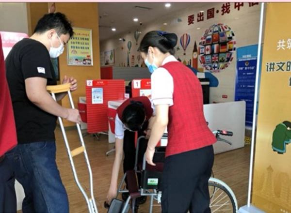 中信银行桂林分行员工为行动不便的客户提供轮椅服务
