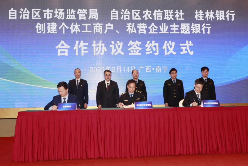 2月14日,自治区联社与自治区市场监管局在南宁签署合作协议,携手推进诚信体系建设,多渠道为广西中小微企业(含个体工商户)营造良好的营商环境。自治区联社党委书记、理事长罗军,自治区市场监管局党组书记、局长李泽,副局长黄震,一级巡视员李昌华出席仪式并见证签约。自治区联社副主任李勇斌、自治区市场监管局副局长刘军代表双方签约。