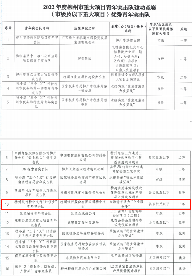 近日,共青团柳州市委员会、柳州市发展和改革委员会及柳州市重点项目建设办公室联合印发了《关于2022年度柳州市重大项目青年突击队建功竞赛优秀组织单位和优秀青年突击队的通报》,其中,全市60支市级青年突击队参与竞赛,最终有16支青年突击队摘得荣誉。柳州银行柳北支行“红领金”青年突击队在竞赛中脱颖而出,荣获三等优秀青年突击队称号!