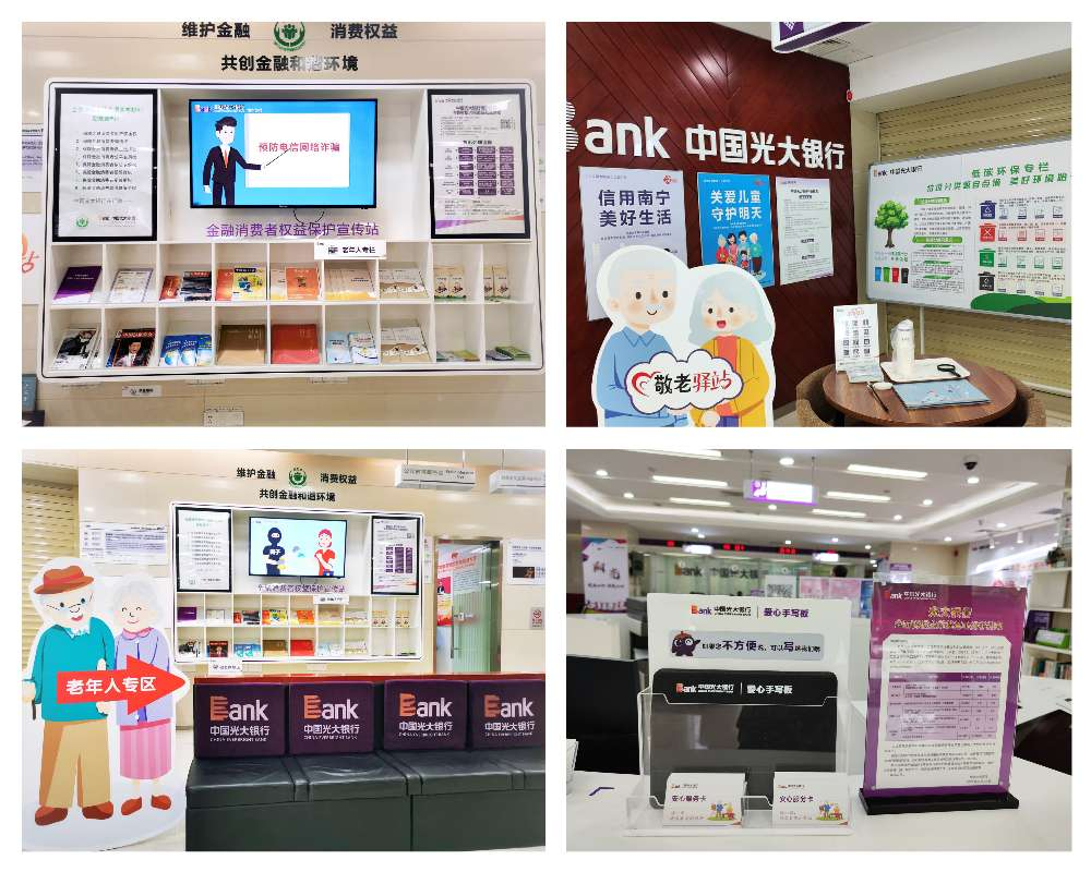 2022年,中国光大银行南宁分行积极组织辖内各网点开展“情暖夕阳”适老化金融服务网点创建活动,推动全辖网点提升适老化金融服务水平,通过积极围绕健全老年人金融服务机制、完善网点服务配套建设、科技赋能解决数字鸿沟问题、拓宽宣传教育形式和方式及加强老年人合法权益保护等五大方面,在实施细则、专属区域、设施设备、人员服务等方面进行了完善。2022年,该行辖属民族大道支行、桃源支行获评“适老化金融服务示范网点称号”。