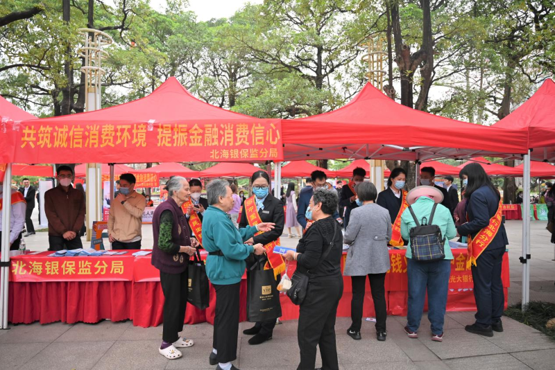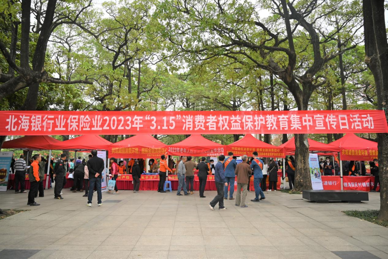 3 月 14 日,由北海银保监分局主办,北海银行业协会、广西北部湾保险行业协会联合承办的2023 年银行业保险业“3.15”消费者权益保护教育宣传周活动在北部湾广场启动。全市41家金融机构齐聚广场,宣讲金融消费知识,送上"零距离"金融服务,守牢市民“钱袋子”。