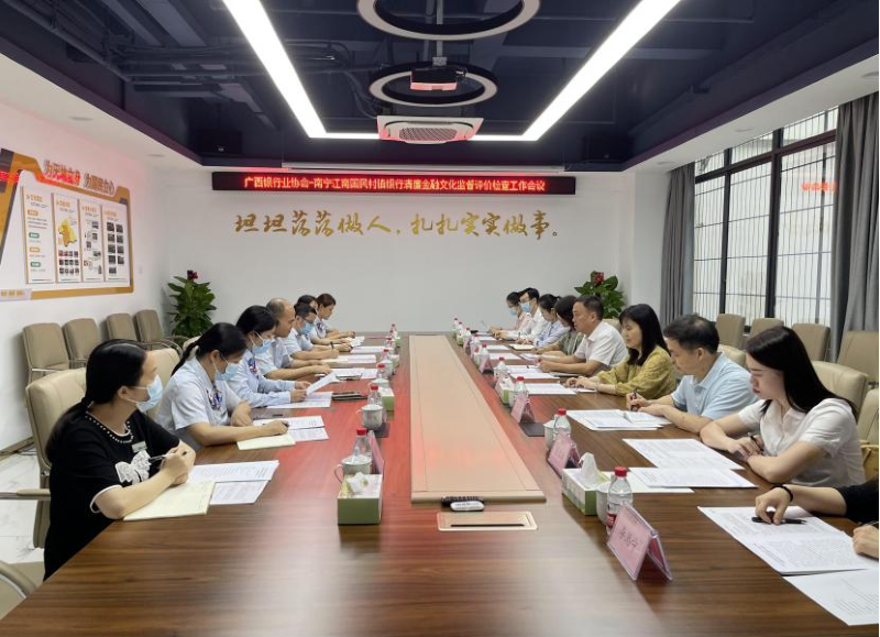 ▲5月17日上午,广西银行业协会监督评价小组莅临南宁江南国民村镇银行开展清廉金融文化建设评价工作