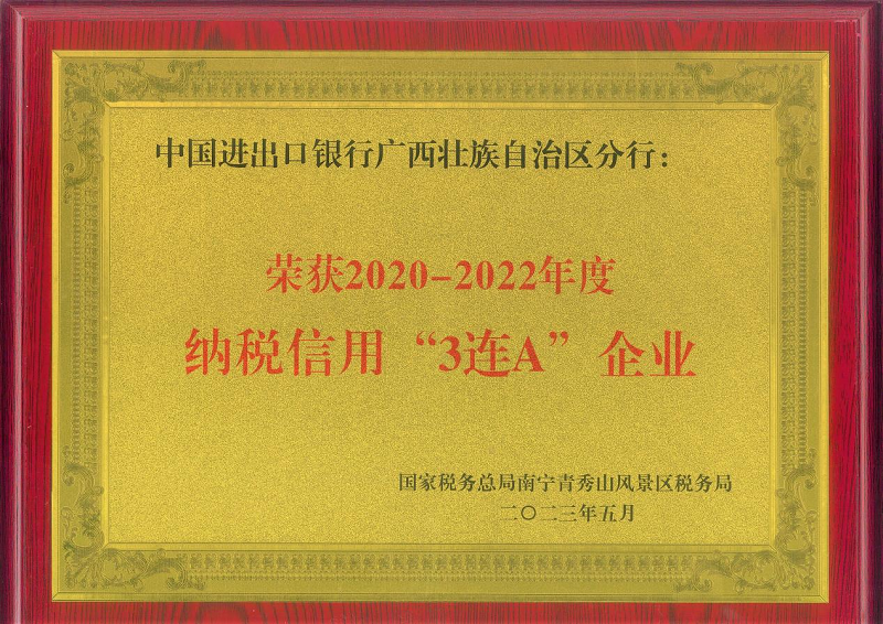 近日,中国进出口银行广西壮族自治区分行(以下简称“进出口银行广西分行”)被国家税务局评为2020-2022年度纳税信用“3连A”企业荣誉称号。