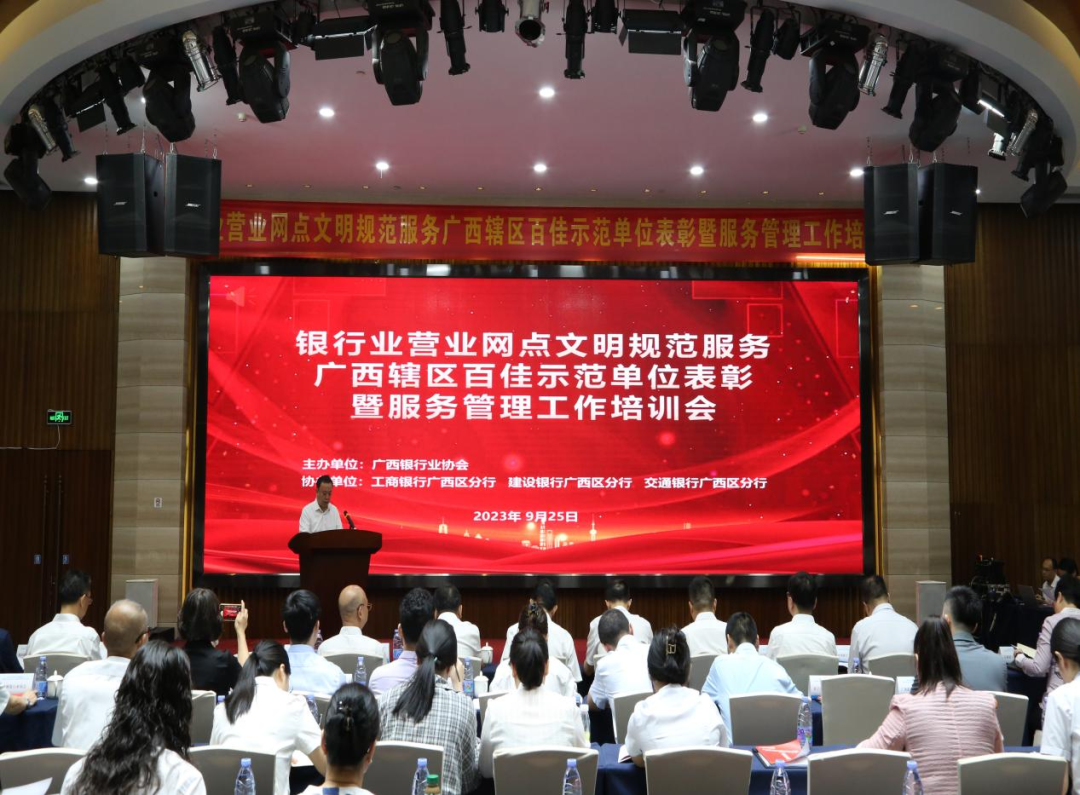 2023年9月25日,“银行业营业网点文明规范服务广西辖区百佳示范单位表彰暨服务管理工作培训会”在南宁顺利召开。本次会议由广西银行业协会主办,工商银行广西区分行、建设银行广西区分行、交通银行广西区分行协办。国家金融监督管理总局广西监管局党委委员、副局长严廷宙;国家金融监督管理总局广西监管局二级巡视员、广西银行业协会常务专职副会长滕仲斌;专职副会长晏伟;各会员银行分管文明规范服务的行领导、部门负责人及工作人员;3家“2022年度银行业营业网点文明规范服务百佳示范单位”代表、25家“2021年度银行业营业网点文明规范服务千佳示范单位”代表、各地市银行业协会相关负责人以及广西银行业协会相关工作人员约120人参加会议。会议由广西银行业协会副会长兼秘书长毛宁主持。