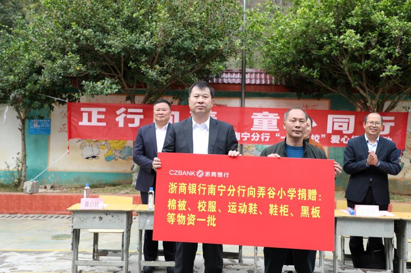 浙商银行南宁分行党委书记胡清水在致辞中表示,“关心教育、公益助学”一直是浙商银行高举善本金融大旗、履行社会责任的重要内容和优良传统。浙商银行南宁分行积极联合社会各方力量,从硬件设施、师资力量、学生精气神等方面,把弄谷小学作为一项长期、持久性教育帮扶工程持续推进。