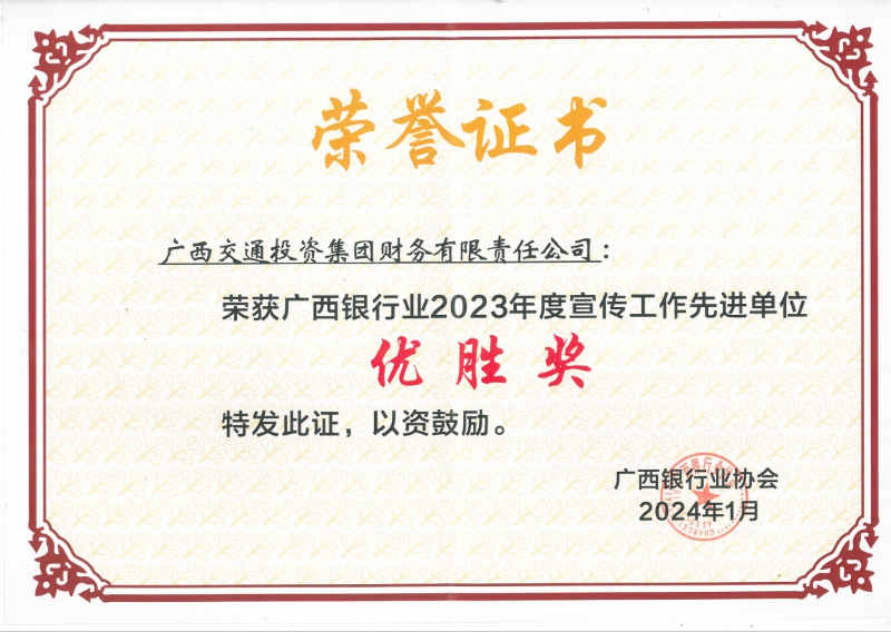 近日,2023年度广西银行业新闻宣传工作总结及表彰会在南宁召开,广西交投财务公司荣获2023年广西银行业宣传工作先进单位“优胜奖”,金融宣传工作成效阔步迈上新台阶。
