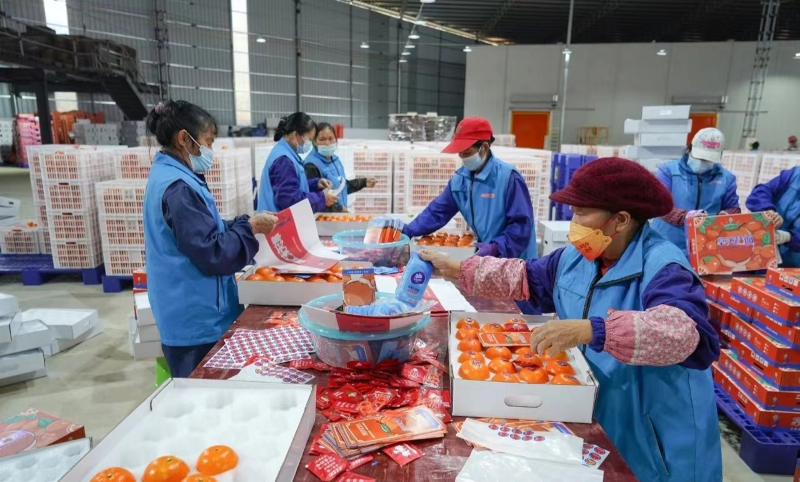 工人正在挑拣分装沃柑