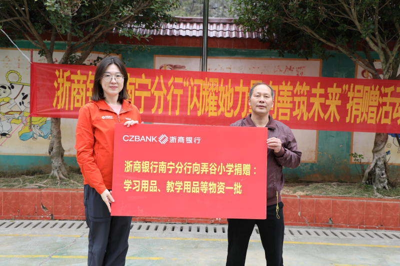 3月8日,国际劳动妇女节当天,浙商银行南宁分行组织女员工代表以及“一行一校”结对帮扶代表赴百色市凌云县沙里瑶族乡弄谷村中心小学(以下简称“弄谷小学”),举办“闪耀她力量 向善筑未来”捐赠活动,给女教职工送上节日祝福,为学校捐赠一批学习用品、教学用品,把金融知识送进校园,持续推动“善本金融”理念落地。