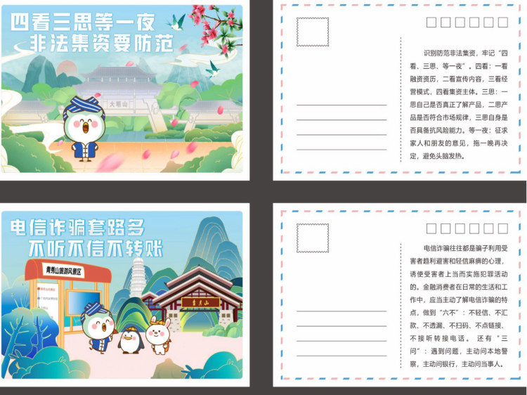 本次活动特别定制了五款招小保金融知识主题明信片,发放在每位参与客户的补给包中。金融知识明信片共设有五大主题,以广西首府南宁特色地标为背景,围绕“个人金融信息、非法集资、电信诈骗、非法金融广告及养老投资骗局”这五个消费者集中关注和金融风险多发问题的热点话题,将风险提示标语和金融知识巧妙嵌入其中,客户通过参与游戏和打卡收集明信片,既能提高风险防范意识和自我保护,又能提升金融知识和金融素养。