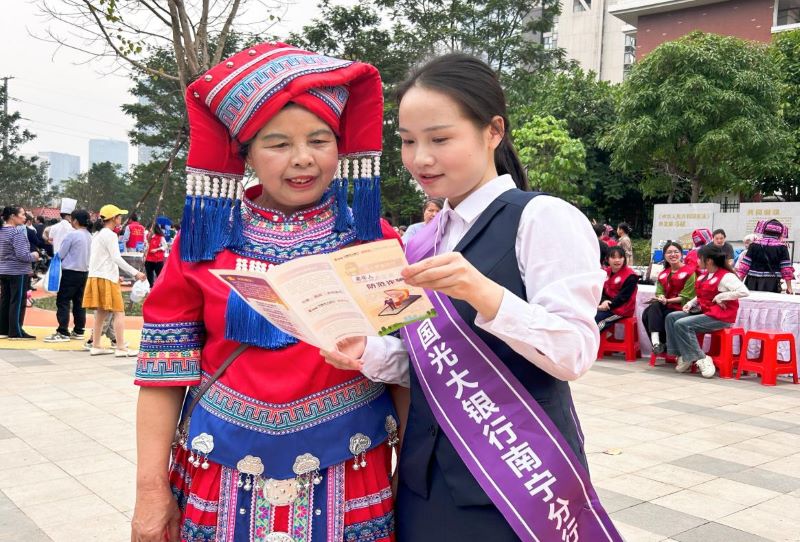 为进一步加强消费者金融教育,提升老年人、少数民族等重点人群的金融素养和风险防范能力,光大银行南宁分行与光大永明保险广西分公司在现场设立金融教育宣传展台,向现场群众发放9号令、适当性、保护个人信息、安全用卡、防范非法金融中介活动、“擦亮眼睛”风险提示等宣传折页,用通俗易懂的语言,通过趣味金融知识问答、生活中常见的典型案例介绍等形式,充分揭示非法金融套路,提醒保护好个人信息,不轻易点击不明链接,陌生转账多核实,共同守住“钱袋子”,助力美好生活。