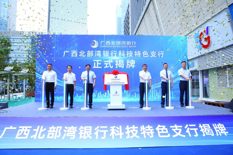 6月16日,广西北部湾银行首家科技特色支行在南宁市正式揭牌。广西北部湾银行行长杨育智出席并致辞,副行长谷壮海主持揭牌仪式,副行长、南宁分行党委书记、行长符韶光,五象新区管委会财政局局长阳强,自治区科技厅成果处副处长何鲁桂,润建股份有限公司执行总裁李群伟,南宁五象新区建设投资有限责任公司董事长何刚,广西南一智能科技有限公司副总经理修强等参加揭牌仪式。