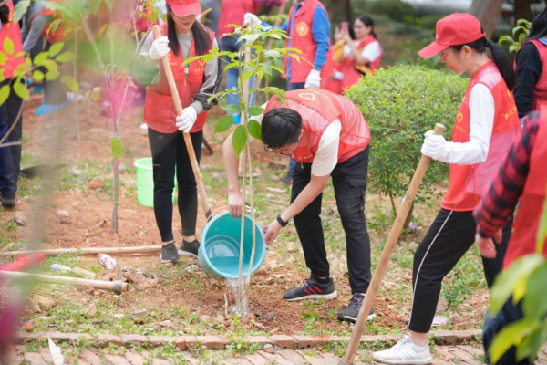 在植树现场,一抹靓丽的金桂星火“志愿红”和新芽绿树相互映衬,格外引人注目。志愿者们用实际行动诠释着雷锋精神,三五人一组分工协作,挖坑、运树、栽植、培土、浇水,精神抖擞、干劲十足,配合默契。经过一个多小时的努力,50余株苗木迎风挺立,萌发出盎然生机。