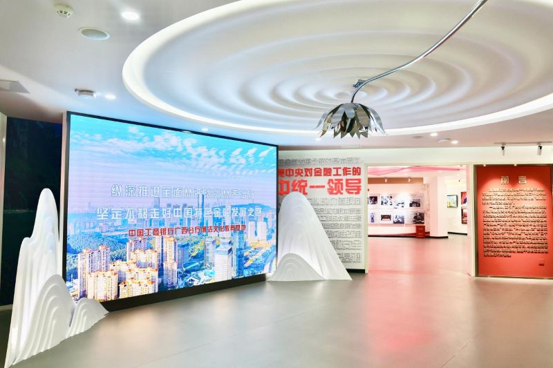 工行广西分行廉洁文化教育基地以“纵深推进全面从严治党从严治行,坚定不移走好中国特色金融发展之路”为主题,分为序厅、主厅(含三个展厅)、尾厅、多功能厅四大区域,“声、像、图、文”全景式展现党的发展历程、金融实践,以及广西分行在工总行坚强领导下推进全面从严治党从严治行,厚植廉洁文化的良好精神风貌。
