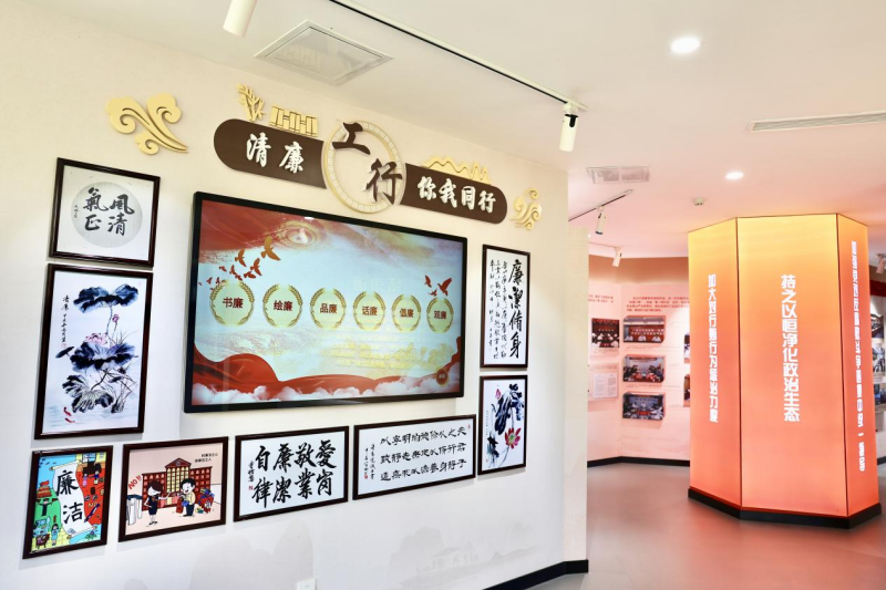 尾厅以“书廉、绘廉、品廉、话廉、倡廉、观廉”板块集中展示员工的清廉书法、绘画、名言警句、心得感悟和微视频等优秀作品,同时设置了电子留言和打卡等互动功能,让参观人员可以留下自己的专属参观印记。