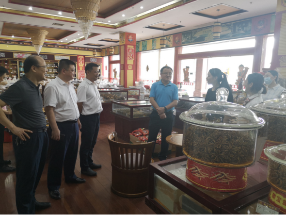 中国工商银行广西分行副行长杨世亮(右四)、玉林分行副行长陈东(左三)一行到玉林中药材市场进行市场调研,深入了解本地中药材商户的生产经营情况及融资需求。