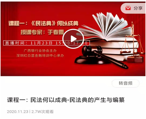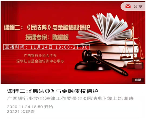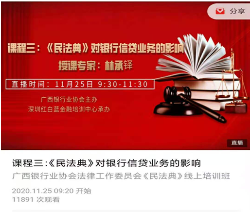 为进一步做好《民法典》的学习宣传工作,引导广西银行业充分认识、深刻领悟《民法典》实施的重要意义和精神实质,提高广西银行业从业人员法律素养,强化法治思维,进一步提升银行风险管理水平。近日,广西银行业协会以“线下”+“线上”的方式举办了《民法典》系列培训活动。本次培训特邀广西高级人民法院民事审判工作专家、中国工商银行总行高级法律顾问、北京市天同律师事务所创始合伙人,中国人民大学教授进行专项授课。广西各银行业金融机构法律事务、风险管理、内控合规及相关业务部门约7万余人次参加了本次培训学习。