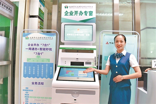 ——科技赋能,打造“一站式”金融服务。北海市区联社进一步深化“放管服”和商事登记制度改革,通过自主研发全国首创的企业开办“一网通办+智能秒批”系统,实现了“7合1”服务。企业在银行自助一体机上即可办结企业开办涉及的设立登记、印章刻制、申领发票等7个事项,大大缩短了企业开户时间。