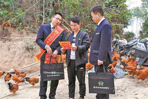 陆川农商行信贷员向养殖户宣传金融政策和产品。