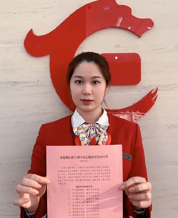 图为华夏银行南宁分行员工展示的诚实守信承诺书