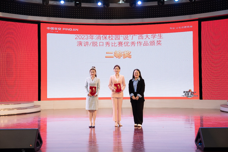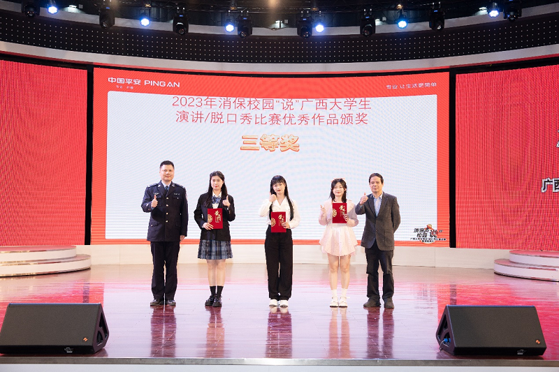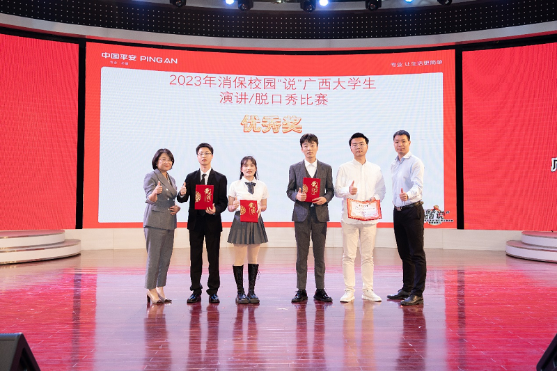 活动伊始,各与会单位领导为本次颁奖典礼致辞。广西大学新闻与传播学院院长王仕勇教授表示,大力倡导广大师生充分发挥自己的作用,结合新闻传播专业特色,推动金融消费者教育和金融知识宣传普及,为建设“平安西大”贡献新传力量。平安产险广西分公司消费者权益保护中心胡泽展经理提出,平安产险本着践行金融为民的初心,切实保护金融消费者权益合法权益。希望借由本次活动大学生都能成为消费者权益保护行动的监督者与见证者,与平安携手造安全、放心、舒心的金融消费环境。平安银行南宁分行蔡秀健行长助理认为,本次“消保校园‘说’”广西大学生脱口秀演讲大赛,既是大学生了解、学习金融知识的机会,又是一次对消保宣传方式创新的有益探索,使用年轻人喜欢的脱口秀等全新的方式,让我们的大学生正真地做到学消保,懂消保,用消保,具有重要的意义。