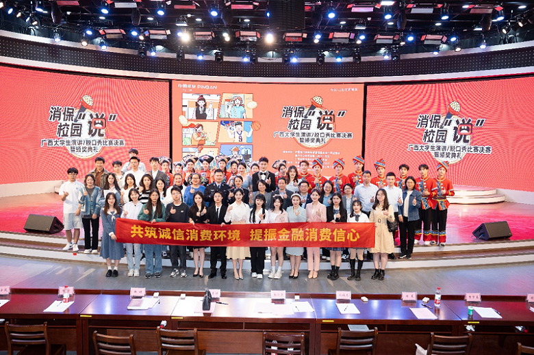 为深入贯彻落实习近平总书记关于持续推动金融消费者教育和金融知识普及指示精神,提升广大青年的金融素养,加快推进金融知识纳入国民教育体系,3月25日,由广西银保监局、南宁市公安局巡警(反诈)支队、广西金融消费权益保护联合会指导,平安银行南宁分行、平安产险广西分公司联合广西大学新闻与传播学院共同举办“消保校园‘说’”广西大学生脱口秀演讲大赛暨颁奖典礼。广西银保监局、南宁市公安局巡警(反诈)支队、广西金融消费权益保护联合会、平安银行南宁分行、平安产险广西分公司、广西大学新闻与传播学院的相关领导及部门负责人,及广西大学在校大学生250余人齐聚广西大学新闻与传播学院融媒体中心,现场参加了本次活动。