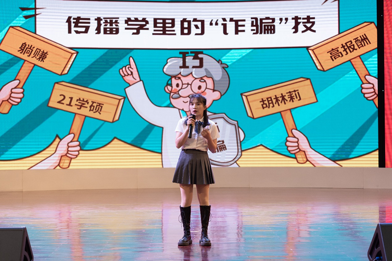 随后,《天上不会掉馅饼,网络诈骗要警惕》特邀嘉宾的精彩开场演讲拉开了本次大赛的序幕。随后,初赛激烈竞争中脱颖而出的十位选手开启了最终的对决。比赛中,十位选手围绕"远离诈骗陷阱,守护金融安全"这一主题,各抒己见,各显神通。有的从身边的小事开始讲起;有的则着眼于国家安全观;有的向观众科普金融知识,有的则结合案例诠释金融安全。选手们精彩的演讲一步步把大赛推向了高潮,在场观众也在一个个表演中学到了防范金融风险的各种技巧。