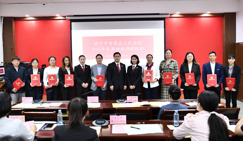 会议还对青秀区人民法院2022年优秀特邀调解组织、优秀调解员进行表彰。广西银行业人民调解委员会被授予优秀特邀调解组织荣誉称号,同时黄淑珍、张建宁两位同志被授予优秀调解员荣誉称号。