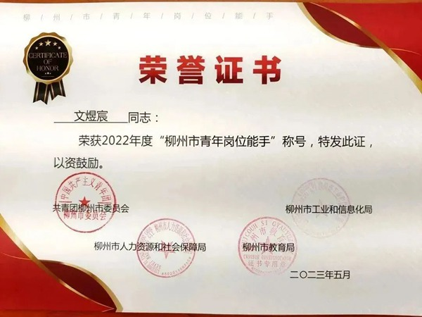 不光是团队表现突出,柳州银行红光支行也涌现出了先进个人,综合柜员文煜宸就荣获了“2022年度柳州市青年岗位能手”称号。