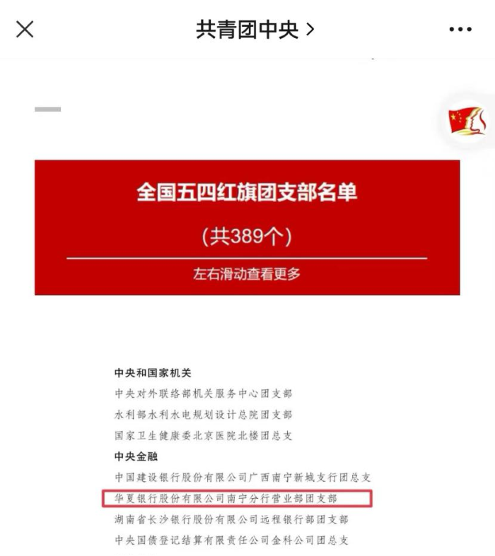 (图:华夏银行南宁分行营业部团支部荣获全国五四红旗团支部称号)