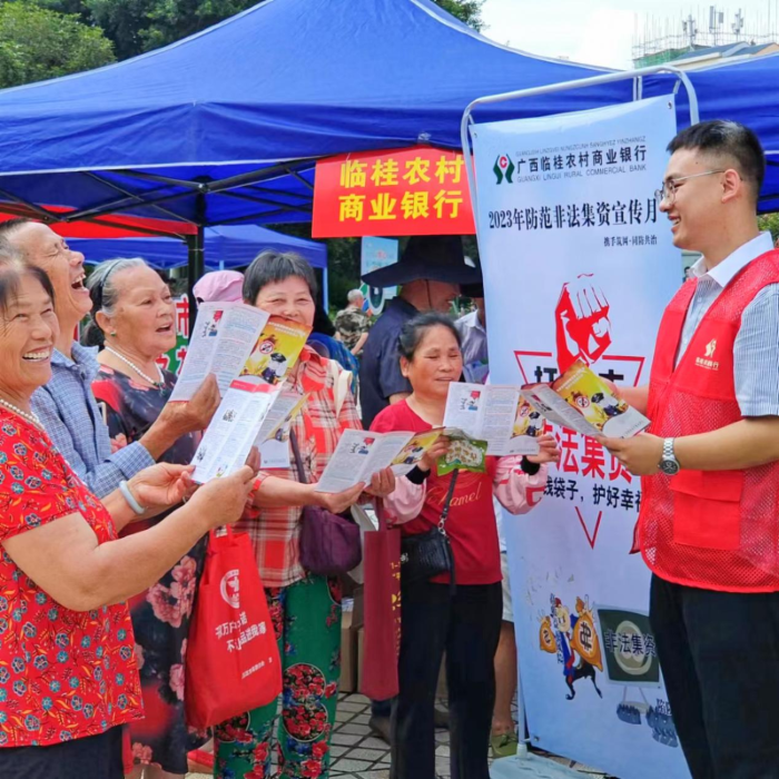 活动中,临桂农商银行志愿者通过在现场设立宣传台、悬挂横幅、发放宣传折页、开展知识竞赛、发放小礼品等群众喜闻乐见的形式,积极宣传防范非法集资相关金融知识,并结合非法集资的真实案例,用简单易懂的语言详细介绍了非法集资的主要特征、表现形式和常用手段,揭露了犯罪分子的常用伎俩,引导群众树立正确的理财观念,提高防范风险意识,警惕各类非法集资风险,自觉抵制高息诱惑。