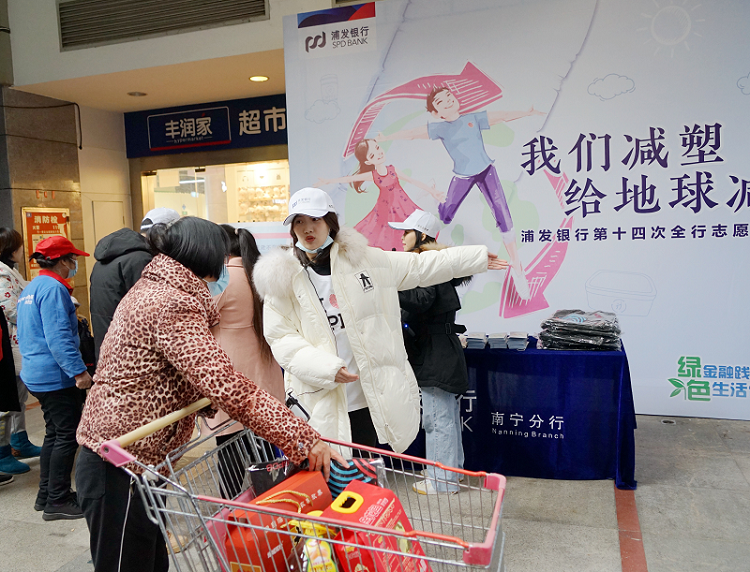 浦发银行南宁分行志愿者广泛宣讲“减塑”理念。