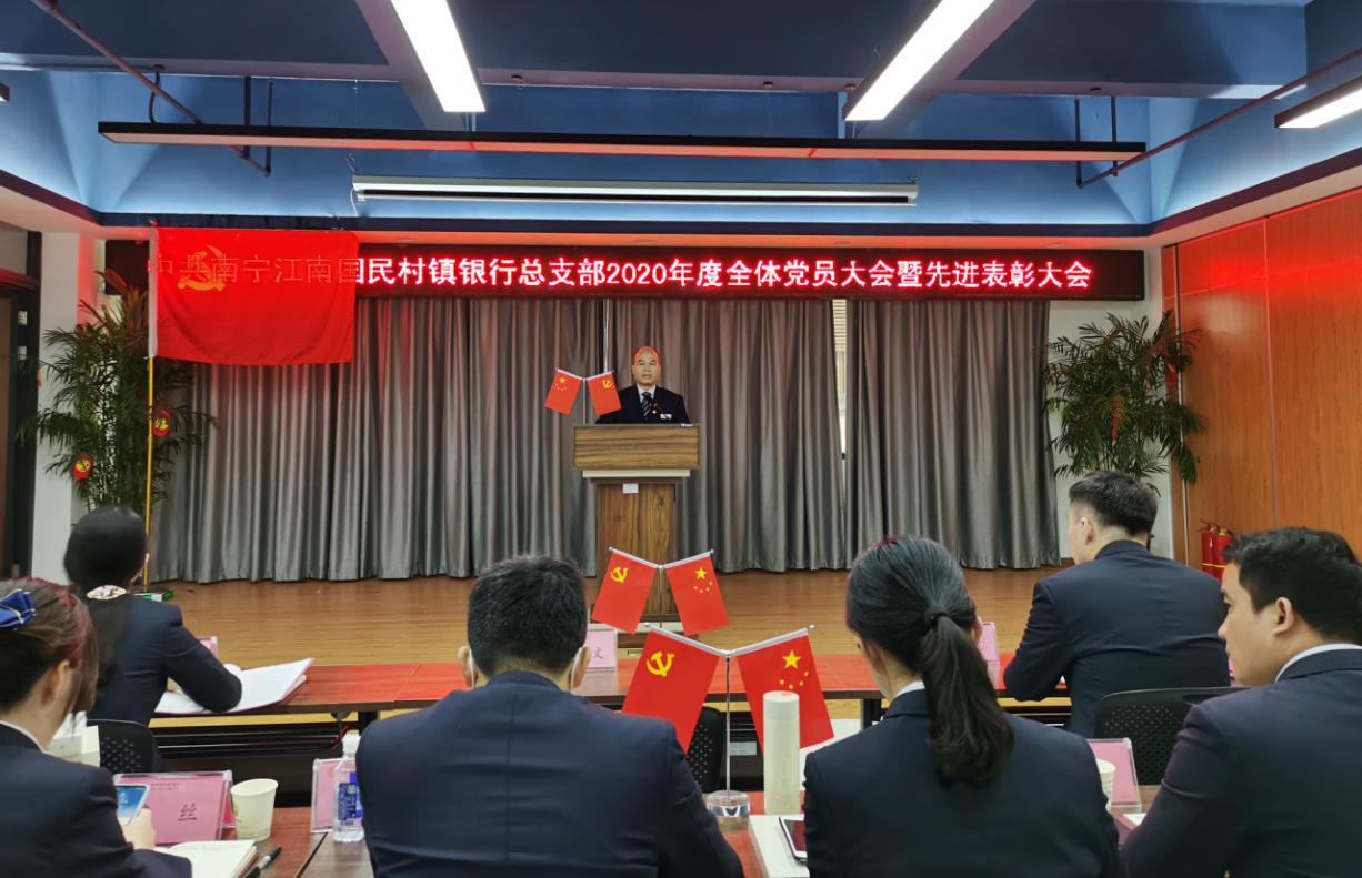 2月26日上午,南宁江南国民村镇银行党总支部组织开展了主题党课活动,并召开了党员大会暨先进表彰大会,各支部全体党员、流动党员、预备党员、入党积极分子共计69人参加会议。