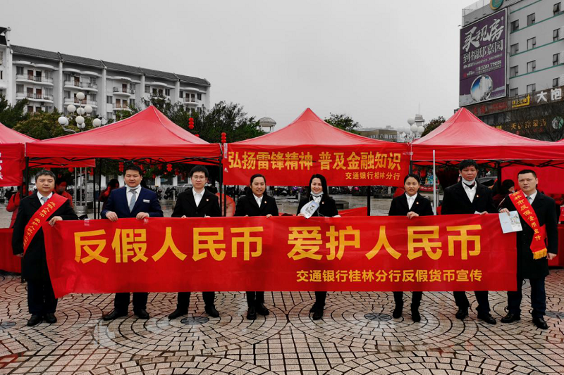 近日,为弘扬无私奉献为人民的服务精神,交通银行桂林分行组成志愿者先锋队前往临桂区金山广场开展“弘扬雷锋精神 普及金融知识”主题公益宣传活动,为市民群众普及反假货币及防网络诈骗金融知识,提升社会公众金融安全意识和风险防控能力。