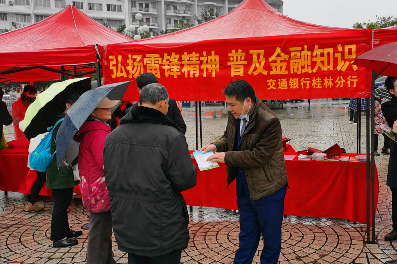 图为交通银行桂林分行开展“弘扬雷锋精神 普及金融知识”主题公益宣传活动。