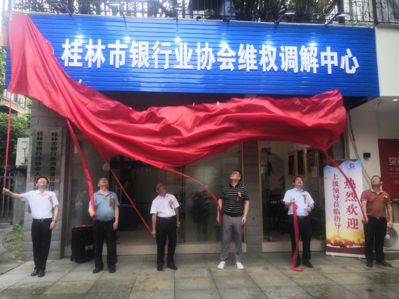 6月13日上午十时,桂林市银行业维权调解中心揭牌仪式在桂林市漓江路18号隆重举行。参加揭牌仪式的有桂林银保监分局一级调研员莫千葵、市信访局副局长程春林、市司法局副局长黄炜炜、会长单位农业银行桂林分行党委委员副行长李通、全体会员单位负责人、桂林市银行业协会全体员工。
