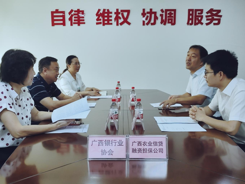 6月13日,广西农业信贷融资担保有限公司(以下简称“广西农担公司”)魏福军董事长一行走访广西银行业协会。广西银行业协会副会长兼秘书长毛宁、广西银行业协会非会员理事韦向玲与广西农担公司魏福军董事长一行,就如何发挥普惠金融作用、加强合作沟通联动、优化金融调解机制等相关工作进行座谈交流,广西银行业纠纷调解中心负责人参加了座谈。