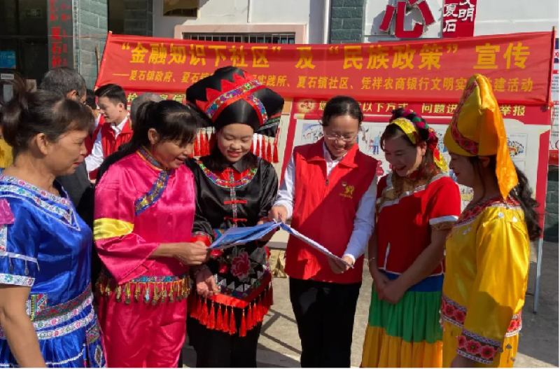 广西农商联合银行将习近平总书记关于加强和改进党的民族工作的重要思想纳入“第一议题”,举办“同庆新中国75华诞 共建农商行健康家园”职工运动会,打造“道中华·看农商”宣传品牌,组建新时代农村金融宣讲团,将中华传统文化与中国特色金融文化、农信社挎包银行精神相结合,增强文化自信。持续推进“万名农信社党员进万村”工程,选派9000多名业务骨干在全区1.8万多个村屯挂任金融专员,广泛开展“‘融’荣与共 桂盛有我”联建共建,聚焦民族政策、金融知识、反电诈宣传等,累计举办金融夜校、宣讲2.2万余场次,办实事9500 余件,推进银政、银企以及各族群众交往交流交融。