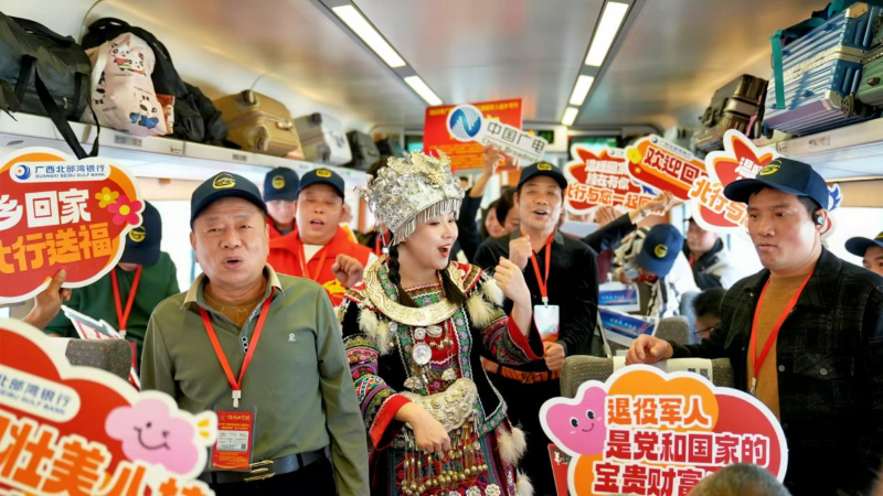 列车上,广西北部湾银行的志愿者们为每一位上车的旅客送上情意满满的家乡特产和专属福袋,一声声“老乡,欢迎回家!”抚慰了游子的思乡之情。