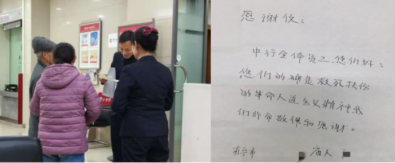 近日,中国银行南宁市民主支行收到一封特别的来信——信中写着“你们救死扶伤的革命人道主义精神,我们非常敬佩和感谢。”八旬老人陆爷爷在家属的陪同下,专程来到支行送上感谢信,感谢中行员工救死扶伤的精神。