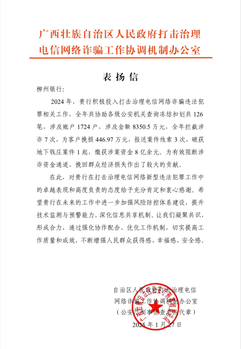 信中表示,柳州银行积极投入打击治理电信网络诈骗违法犯罪相关工作,全年共协助各级公安机关查询冻结扣划共 126 笔,涉及账户 1724 户,涉及金额 8350.5 万元,全年拦截涉诈 7 次,为客户挽损 446.97 万元,报送案件线索 3 次,破获地下钱庄案件 1 起,缴获涉案资金 8 亿余元。为有效阻断涉诈资金通道、挽回群众经济损失作出了较大的贡献。