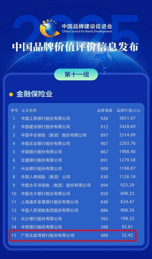 5月10日,由中国品牌建设促进会、中国资产评估协会主办,新华社品牌工作办公室、《中国品牌》杂志社等单位承办的“2025中国品牌价值评价信息”在浙江德清正式发布。广西北部湾银行以品牌强度488、品牌价值52.42亿元荣登全国金融保险业榜单,成为广西首家、也是唯一一家登上榜单的地方法人银行。这是北行品牌价值首次获得国家级权威机构认可,标志着北行品牌建设实现从“区域领先”到“全国知名”的历史性跨越,“建设国内一流精品银行”愿景取得阶段性成果。